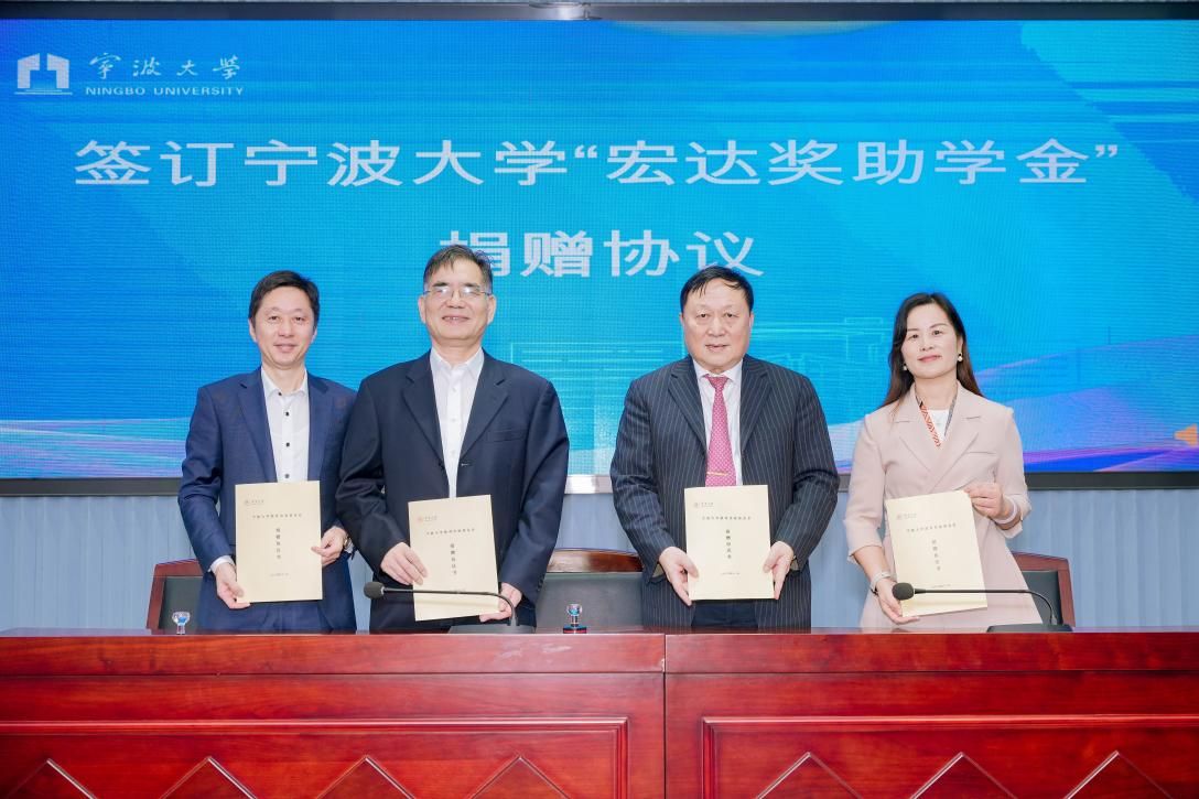 宁波宏达货柜储运有限公司董事长陆汉幸、宁波市北仑区慈善总会会长张如平、糖心视频 党委书记史宏协、潘天寿建筑与艺术设计糖心视频 党委书记韩雯琛共同完成捐赠仪式签约。
