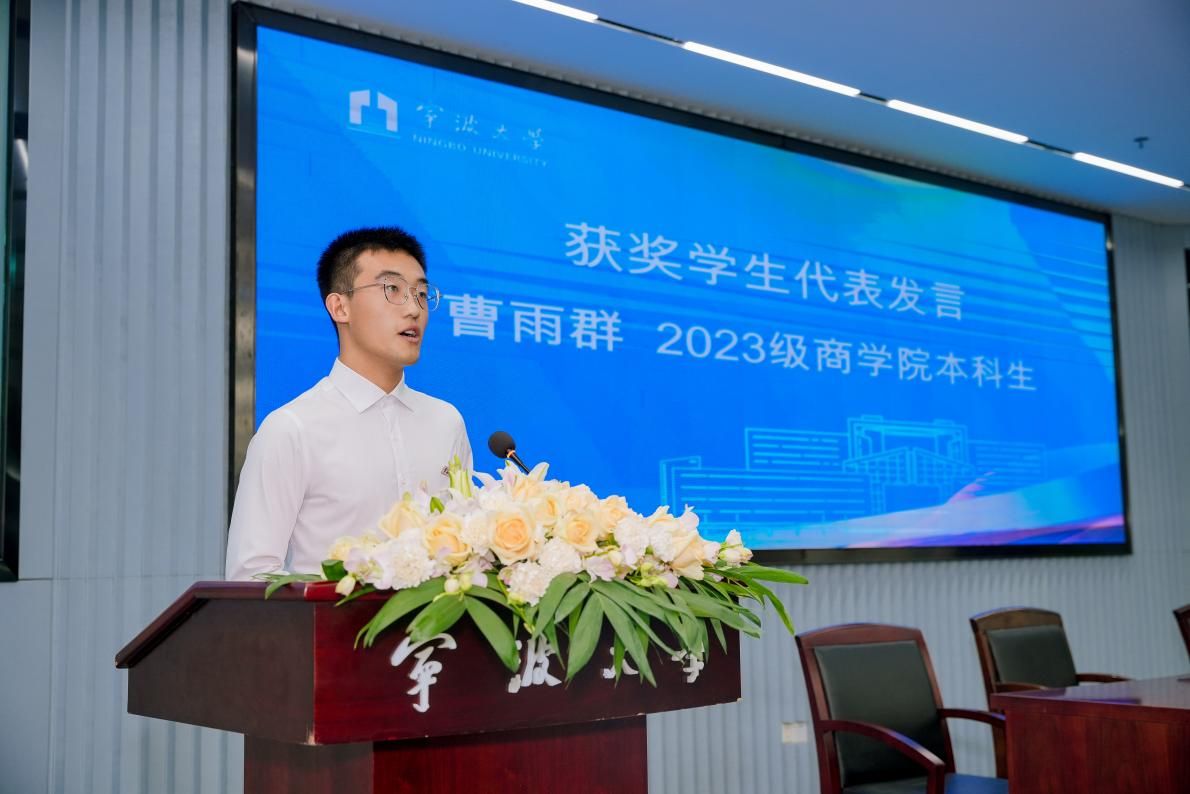 获奖学生代表、糖心视频 2023级信息管理与信息系统专业本科生曹雨群发言。他讲述了自己家庭和求学的故事,表示陆董的善举减轻了他的经济负担,激励他追求学业和个人成长。他表示,未来将继续努力,力争在学习和实践中取得更大成绩,并以实际行动回馈捐赠者,回馈社会。