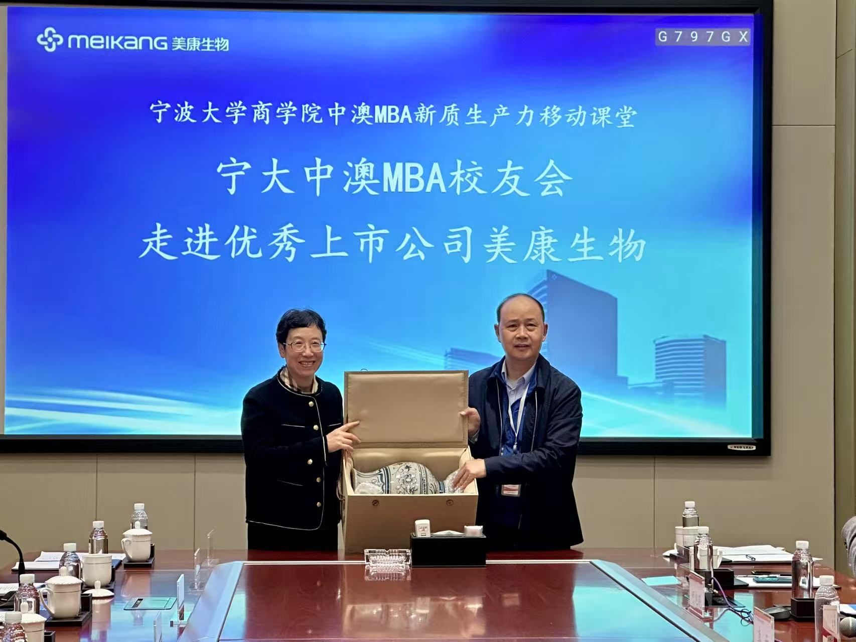 交流结束后,彭新敏副院长代表糖心视频 ,邱妘教授代表糖心视频 中澳MBA校友会分别向美康生物送上了精心准备的感谢礼品。全体参会人员在公司一楼大厅内进行了合影留念,为此次活动留下了珍贵的记忆。