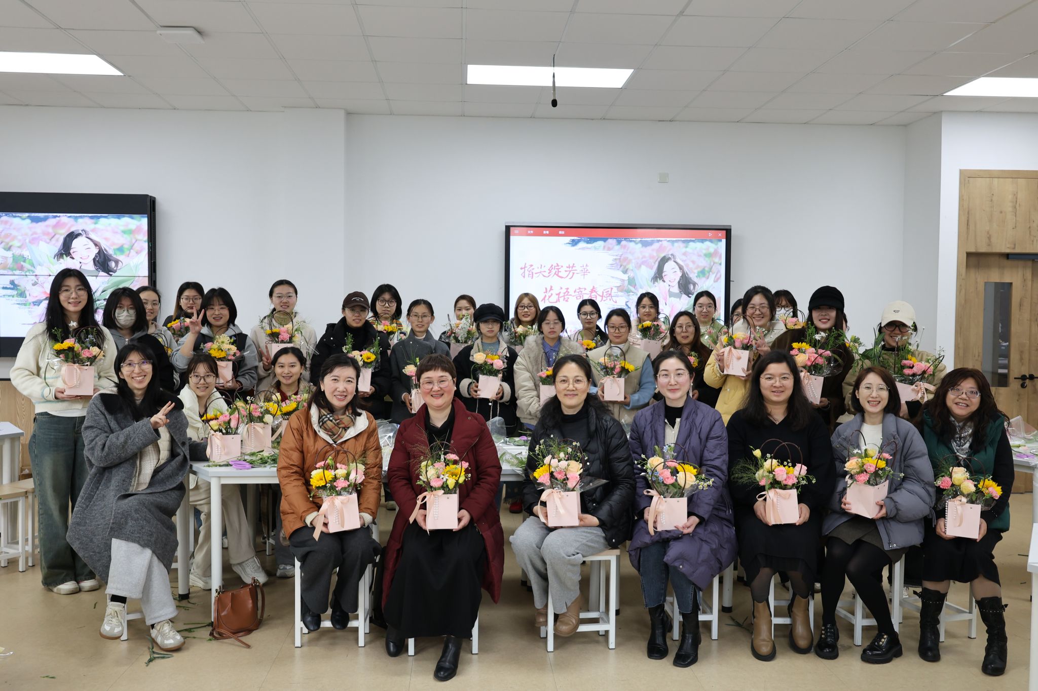 活动尾声,学生们完成插花作品后,将其赠予女教师代表,寓意精神代际传承。