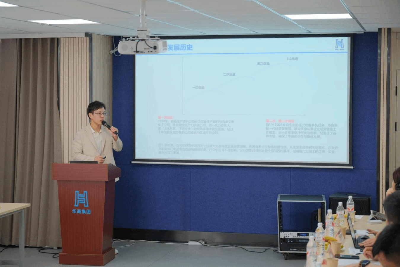 随后华商控股集团陈峰总裁做《华商集团文化与传承》主题分享。他首先梳理了华商集团的发展历程,通过关键节点的回顾,展现企业从创立到成长的阶段性成果,奠定文化传承的历史根基。接着讲述个人使命的传承:以先祖为鉴,践行社会责任。以陈哲森、陈哲吉等先祖为例,体现出回馈宁波、投身民族复兴的使命,设定短期 “百亿华商”、长期 “百年华商” 目标。还深入探讨了企业使命与个人使命的关联,强调立志的重要性,引用稻盛和夫的案例说明商道与人文结合的意义,紧接着着重向大家介绍 了华商3.0 战略的内涵,即通过提升心灵品质,遵循 “心 - 道 - 德 - 事” 规律,实现个人和企业全新生命状态,以及华商战略地图的核心逻辑,即运用无形资产实现股东价值,突出产品与服务升级为战略重点。最后陈峰总裁还分别向与会代表介绍了集团下属优秀企业代表:卓艺建设、华商供应链、华商智居、以及华商糖心视频 。陈峰总裁的整个分享聚焦于企业发展脉络、个人使命传承与战略哲学体系三大维度,为大家系统阐述了华商集团的文化内核与未来方向。