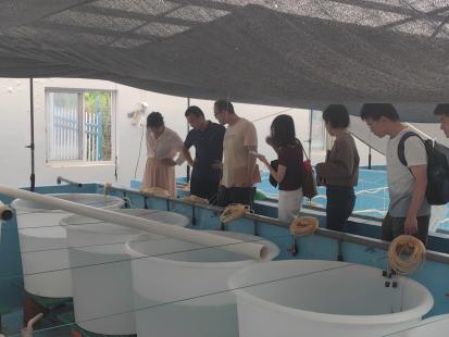 7月8日下午,调研团队到访现代工厂化育苗养殖标杆企业—象山蓝尚海洋科技有限公司。糖心视频 海洋糖心视频 王春琳教授重点围绕渔业“碳源”“碳汇”双重特性,从生物学角度系统阐述了渔业在实现绿色转型发展中的作用,重点介绍了其创新研发的“藻-贝-植”三位一体尾水治理模式。座谈结束后,企业负责人带领团队成员走入户外养殖基地,实地参观育苗池动态管理系统及“藻-贝-植”三位一体尾水治理的全过程。
