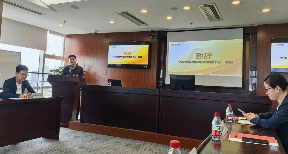 随后,宁大中澳MBA校友会会长汪新宇代表校友会致辞。他指出这次“走进宁波银行”活动是中澳MBA校友会“1+1模式投资金融板块”今年系列活动的第一站,他衷心感谢宁波银行对第十三届中澳MBA论坛活动的大力支持。他介绍校友会自成立以来始终践行"服务母校、服务校友、服务校友企业"的宗旨,现已形成七大产业板块的"1+1"特色模式。作为宁波市值最高的上市公司,宁波银行凭借差异化、国际化、数字化的创新优势成为本次活动的首选。汪会长还分享了上周参加宁波银行新加坡考察的收获,强调在当前中美贸易背景下,金融资本对企业出海、技术革新和新赛道布局的重要支撑作用。校友会期待以本次活动为起点,深化与宁波银行的战略合作,助力校友企业高质量发展。