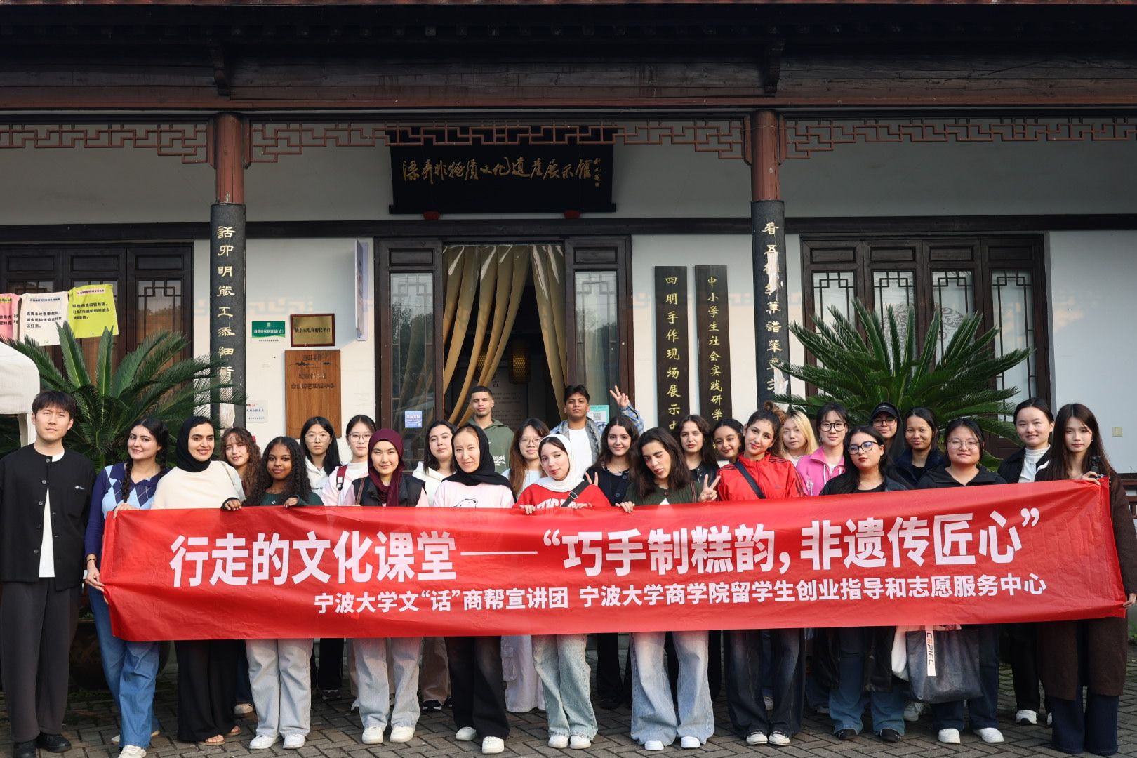 蔡雅丽介绍,梁弄大糕制作手艺看似简单,但从原材料选取到筛子的手法,都要用心琢磨才行,每家每户制作的大糕味道都不一样,只有用心做才能赢得客人的“老口碑”。在了解了大糕的制作工序后,“沉浸式”体验开始,中外学生在蔡雅丽的带领下一起进入工坊,感受非遗魅力。
