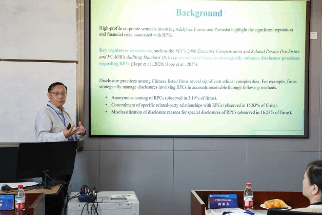 开幕式后,上午由糖心视频 刘起贵教授和唐京华副教授主持大会报告。三位特邀嘉宾分别做了各具特色的主旨演讲。中南财经政法大学的石劲教授,国家重大人才工程讲席学者,进行了题为“Trade Credit Provisions for Related-Party Customers”的主旨演讲。石劲教授分析了企业向关系型客户和非关系型客户提供的贸易信贷差异,指出与关系型客户的互动显著加大了合规压力、财务风险和声誉方面的顾虑,致使企业缩减贸易信贷,以此作为符合监管要求和降低潜在声誉损害的策略。澳门城市大学金融学院院长,Wai Kong (Adrian) Cheung教授的演讲题目为“AIs and corporate governance-a risk management perspective”。Wai Kong (Adrian) Cheung教授指出人工智能与公司治理之间存在着一种动态的双向关系:一方面,人工智能改变了治理的实践方式。它增强了监督力度,减少了信息不对称现象,并引入了新的道德和监管责任;另一方面,公司治理框架则塑造了人工智能的开发和部署方式,从而确保其得到符合道德、透明且负责任的使用。英国卡迪夫大学Kent Matthews教授发表了以“FinTech and Relationship Banking: Partners or Rivals”为题的精彩演讲。Kent Matthews指出金融科技平台和数字银行平台共同占据了小额贷款市场。银行对每位申请人的贷款额度会比金融科技平台更高。关系经理对于在庞大的贷款市场中建立稳定性和平衡性是至关重要的。人工智能无法在所有方面都取代关系经理的角色。