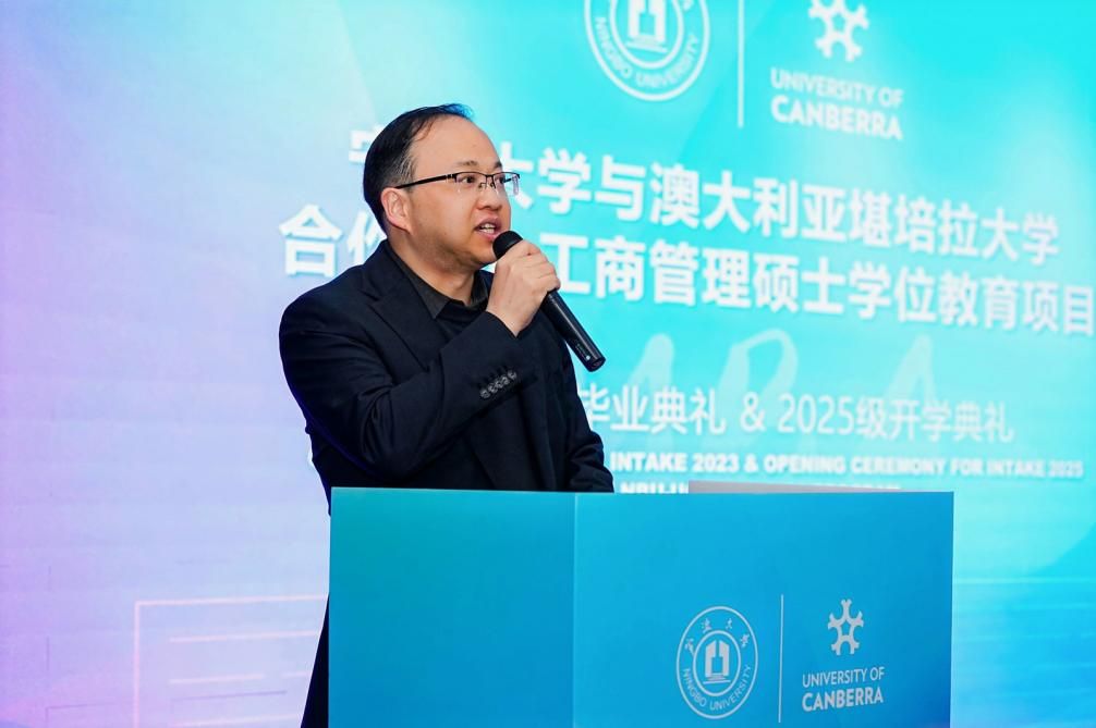 周新苗院长随后代表学院致辞。她向出席典礼的各位嘉宾表示热烈欢迎与衷心感谢,对长期以来支持项目发展的各方所付出的努力表示高度赞赏。她祝贺2025届毕业生圆满完成两年学业,并指出毕业并非终点,而是一个崭新的起点——标志着大家正式成为两校校友,开启人生新的征程。她寄语毕业生,在顺境中要勇往直前,在逆境中亦要善待自己、永不言弃,这是实现持续成长与成功的重要信念。同时,她也代表学院欢迎中澳MBA项目2025级新生加入,勉励大家珍惜宝贵的学习机会,在未来两年中积极探索、互促共进、携手成长。