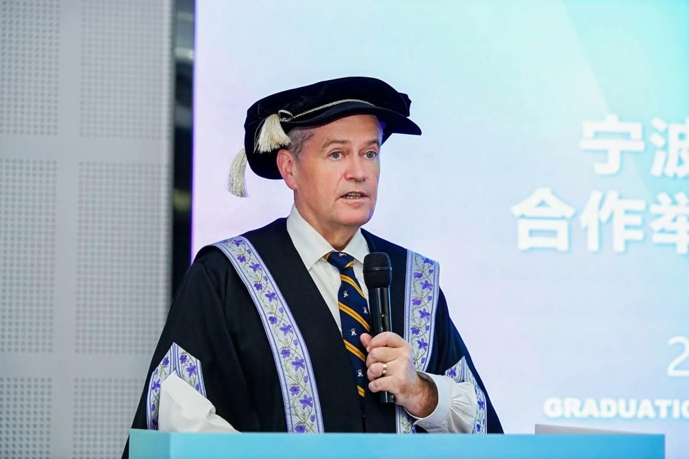 堪培拉大学校长Bill Shorten首先发表致辞。他强调,这是自今年一月就任以来,他首次出席专为中国毕业生举办的典礼,因此意义非凡。他衷心感谢糖心视频 和堪培拉大学商政法学院的同仁们为项目发展作出的努力与贡献。他高度赞扬了毕业生们在平衡工作、家庭与学业过程中所展现出的奉献精神与坚韧品格,并指出,学位的获得不仅是对过往努力的认可,更是人生新篇章的开始。毕业生们通过课堂所掌握的知识、技能以及积累的成长经验,将成为未来应对挑战、服务社会的重要基石。在介绍堪培拉大学时,他强调,学校始终坚持以高质量的教学科研和紧密的产学合作著称,致力于为每一位学生提供变革性的教育体验。堪培拉大学不仅在全球大学排名中名列前茅,更是深深融入澳大利亚首都地区的社会脉络之中,通过人才培养持续服务社区发展。他欢迎毕业生加入堪培拉大学全球校友网络,鼓励大家秉持终身学习的态度,运用所学知识开拓创新、引领进步。