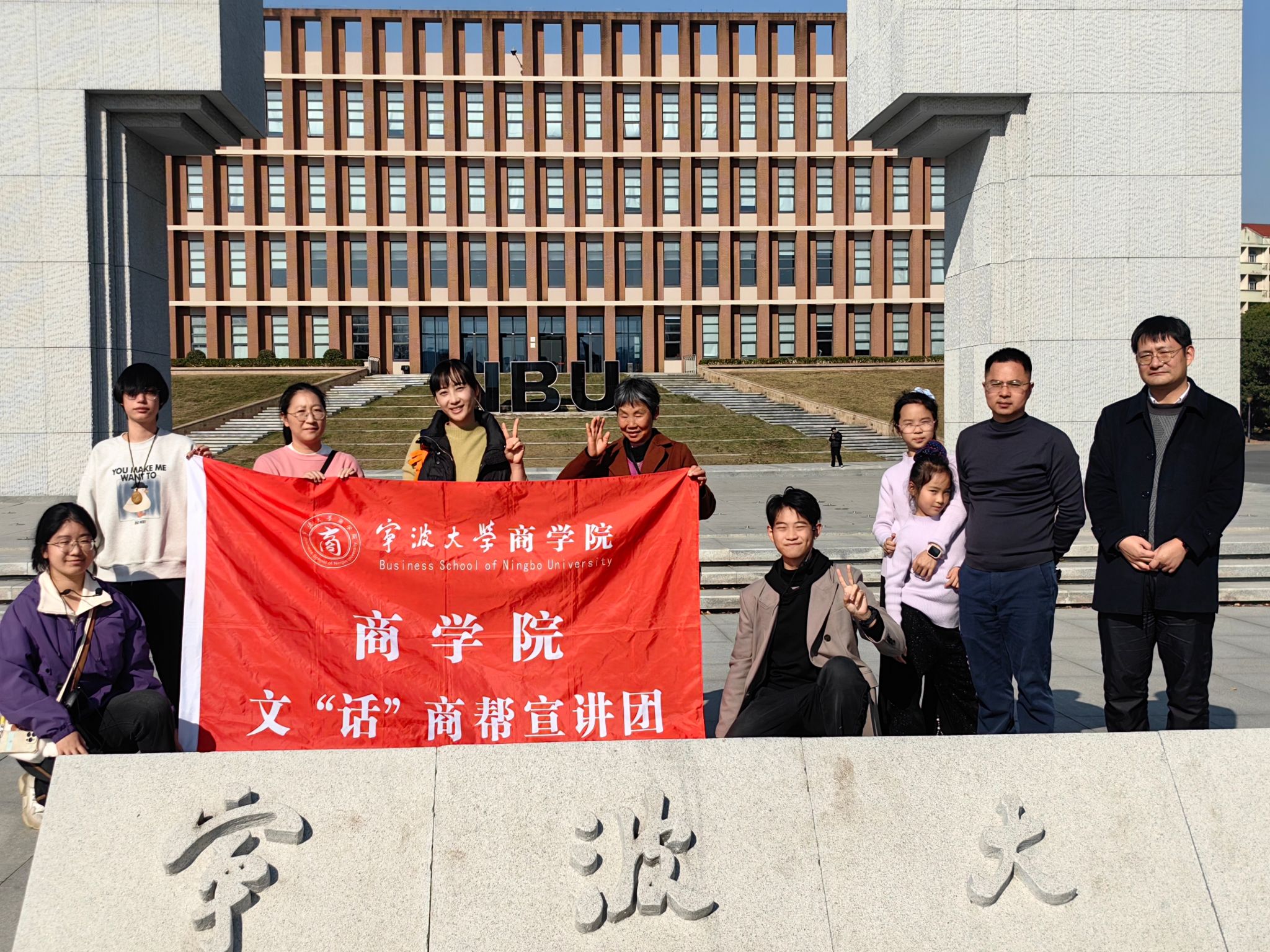 参访团一行自东校区北大门启程,沿“宁波帮”捐资建筑群黄金路线,先后打卡曹光彪信息楼、绣山工程大楼、林杏琴会堂、曹光彪科技楼等标志性楼宇。余家舰以“一楼一故事”的形式,生动讲述曹光彪、朱绣山、赵安中等旅外甬商“穷则思变、富而思源”的捐学义举;在林杏琴会堂前,黄梓懿补充介绍会堂“以慈母名讳命名”的温情细节,让“宁波帮精神”在嘉宾心中可触可感。