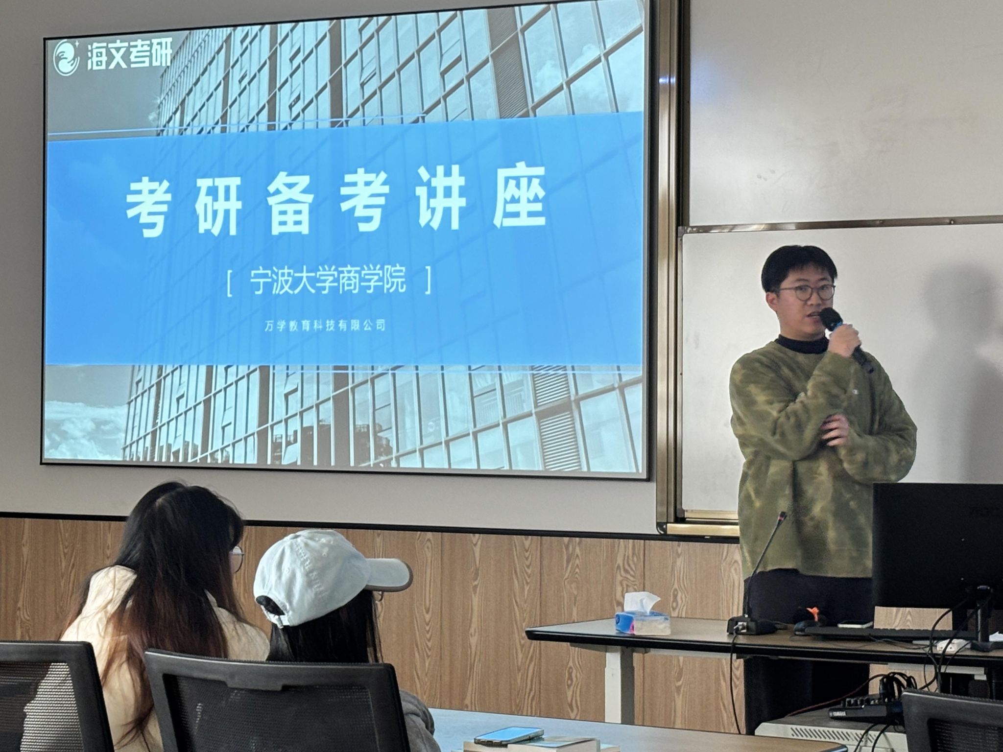 会议伊始,主持人对万学海文做简单介绍;其次,李湘佳对考研形势、院校专业选择、复习方法以及考研流程进行了详细的分析。