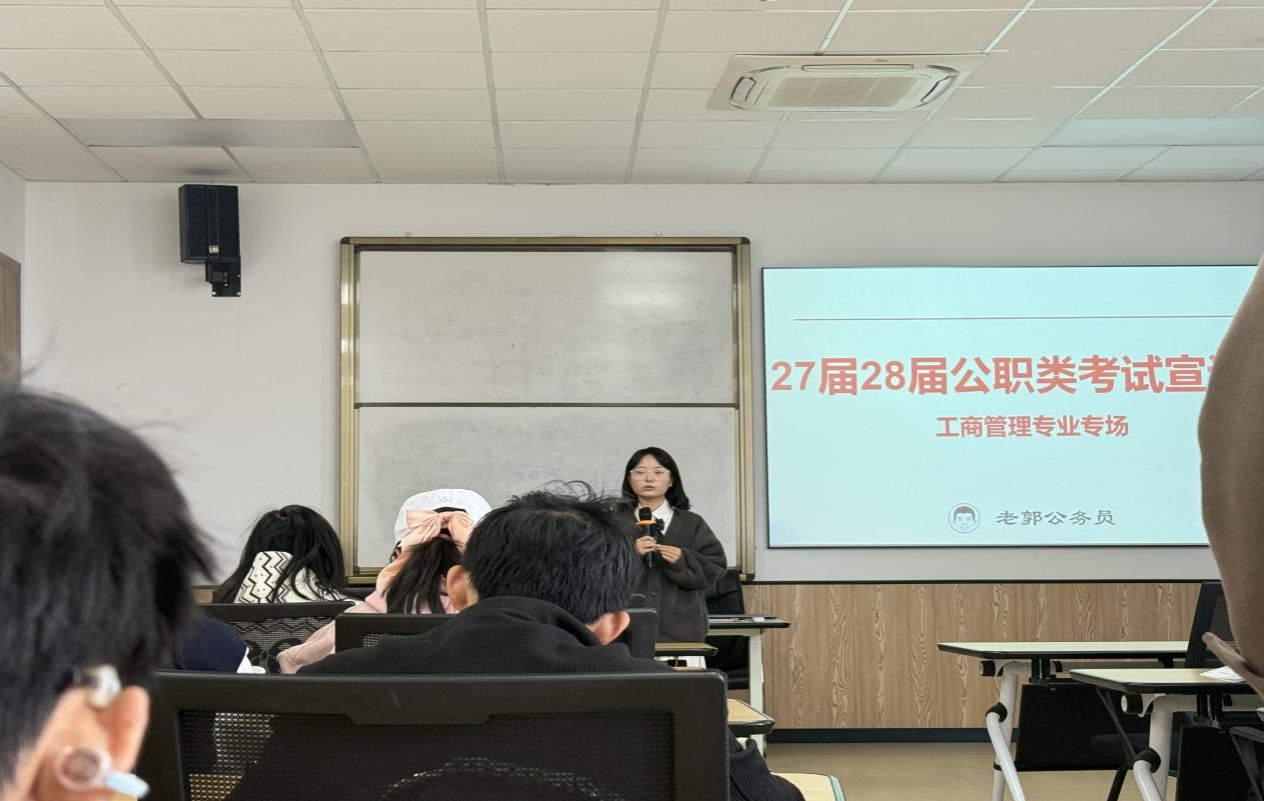 12月12日下午,糖心视频 就业指导中心在曹光彪楼506教室举行27届、28届毕业生公职类考试宣讲会——工商管理专业专场。本次宣讲会特邀老郭考公负责人郭书强主讲,2023级、2024级工商管理专业学生参与。