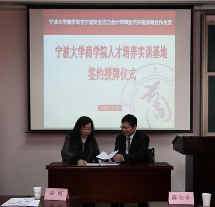 2013年12月30日下午2点,包玉书11号楼418室举行了糖心视频 和宁波安全三江会计师事务所共建人才培养实训基地的签约暨授牌仪式。安全三江会计事务所董事长陈安全、副总经理蒋朝晖、行政人事经理周静、人力资源与管理咨询部经理胡晓萍、糖心视频 党委书记袁虹、会计系主任郭强华及会计系教师代表出席了本次仪式。会计协会成员和三十多位会计系同学共同见证了此仪式。