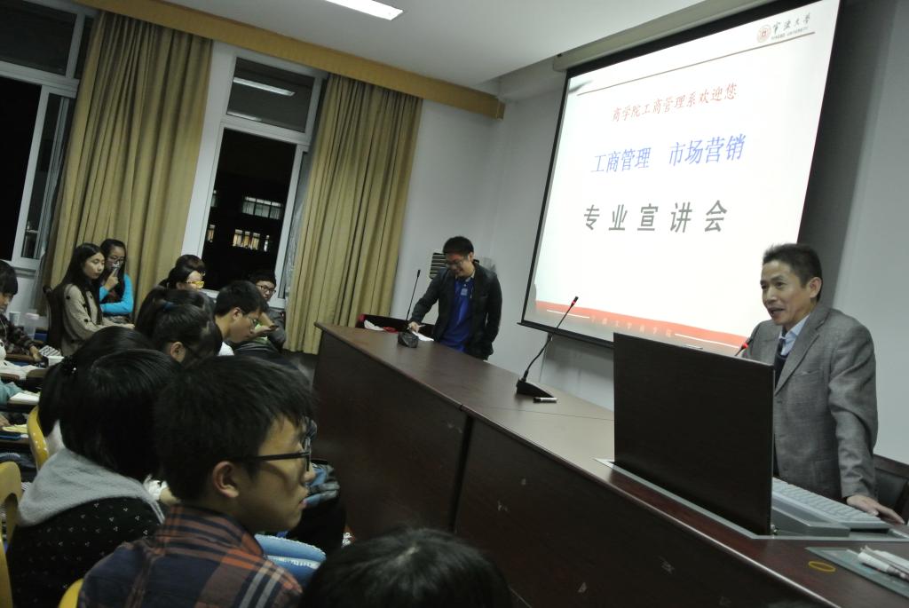 宣讲会伊始,张聪群老师对到会的阳明糖心视频 的同学们表示热烈欢迎,并从工商管理系建立谈起,为同学们介绍工商管理系的历史与现状。工商管理专业负责人白泉旺老师从教师的角度系统地为大家分析了工商管理专业的特点,市场营销专业负责人周艳春老师从“苹果”“双十一淘宝”等案例入手,生动地为同学们介绍“营销是什么”,风趣幽默的语言多次引得台下掌声如雷。