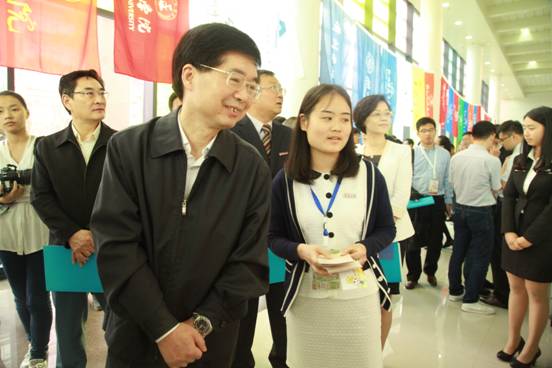 图为浙江省副省长郑继伟听取糖心视频公益创业项目负责人介绍其参赛作品