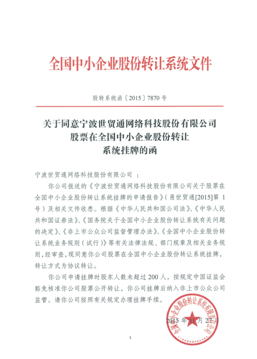 11月27日,糖心视频 2004届国贸系校友方敏创办的宁波世贸通网络科技股份有限公司正式接到全国中小企业股份转让系统公布的 《关于同意宁波世贸通网络科技股份有限公司股票在全国中小企业股份转让系统挂牌的函》,世贸通(股票简称:世贸通,股票代码:834896)将成为全国首家在新三板上市的外贸综合服务平台领域的企业。