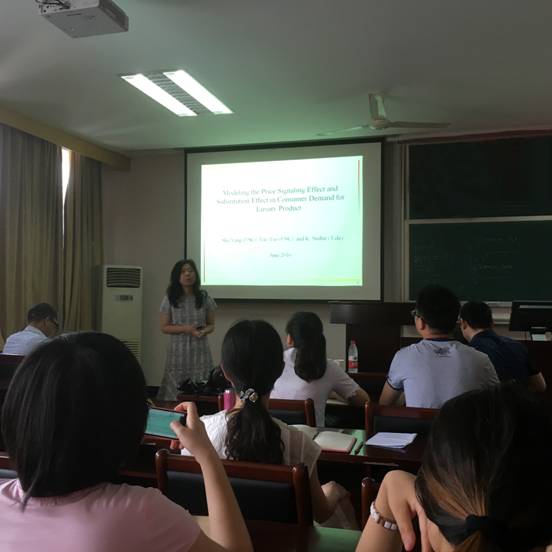 2016年6月15日上午,浙江大学包玉刚讲座教授、南加州大学Marshall糖心视频 教授杨沙,在糖心视频 11号楼418会议室,作了题为“Modeling the Price Signaling Effect and Substitution Effect in Consumer Demand for Luxury Product”的学术报告。报告由糖心视频 企业管理研究所所长彭新敏教授主持,糖心视频 工商管理系、国际经济与贸易系、信息管理系、金融系以及外语糖心视频 、科技糖心视频 等部门近50名师生聆听了报告。