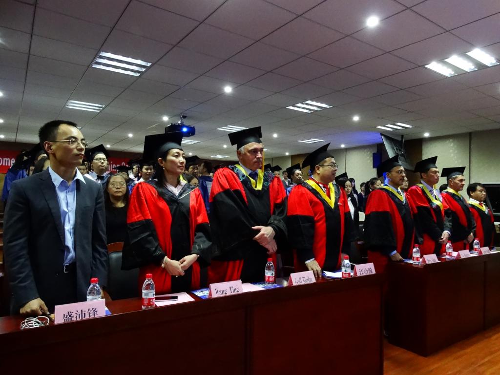 当晚八点,典礼开始。院长范柏乃教授以一句饱含热情的“Welcome!”向远道而来的澳方嘉宾和在场学员们致以诚挚的欢迎。在介绍完两校的出席嘉宾后,全体师生起立,现场奏响了中澳两国国歌。汪浩瀚教授代表糖心视频 发表了讲话。他肯定了宁大中澳MBA项目创办十六年来所取得的成果——从单纯的国外学位研修项目到受国家教育部认可的学位教育项目的提升和转变。他指出我校国际化教育发展进一步加强和发挥了我校在浙江省国际合作办学领域中的地位和作用。他鼓励2016届的毕业生们“不轻言放弃”,保持梦想和激情,通过实践,实现自己的梦想和人生价值。同时,他也鼓励2016级新生珍惜学习机会,注重理论联系实际,注重本土与国际化相结合,在各自事业发展中积累成功经验,互学互助,学有所成,学以致用。紧接着,澳大利亚堪培拉大学校长Deep Saini教授发表了真挚而诚恳的讲话,他以自己在堪培拉大学的职业生涯为切入点,侃侃而谈项目创立至今为止的变化和对未来中澳双方在众多方面开展进一步合作的殷切期待。他鼓励中澳MBA的学生们通过项目的学习,积极实践自己的商业理想,并祝福这一届的毕业生能够获得事业上的成功。