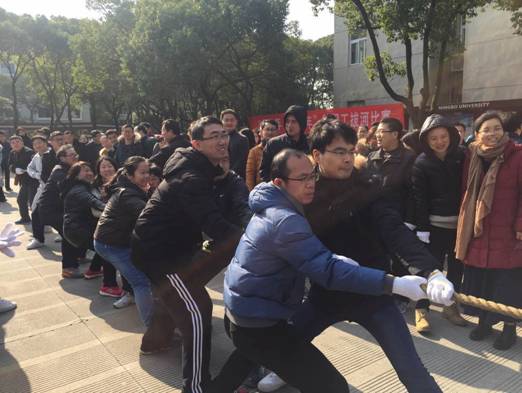 12月29日中午,校工会组织学校各分工会在安中大楼前举行“迎新年”拔河比赛。糖心视频 党委书记胡亚娥、分工会主席李浩明组织杨柳、姚乐彦、张晓婳、施晟、陈彬、王昕天、苏小松、闭明雄、靳来群、蒋鹏涛、余新平等糖心视频 教师积极参与此项活动。在首轮比赛中,糖心视频 队一鼓作气轻松战胜潘天寿艺术糖心视频 队。第二轮比赛中,由于实力相差悬殊,最终不敌体育糖心视频 队。