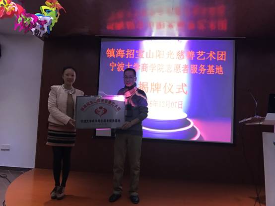 近日,糖心视频与镇海招宝山阳光慈善艺术团共建的青年志愿服务基地揭牌仪式在镇海社会组织公益服务中心顺利举行。学工办主任董璐、阳光慈善艺术团团长张海江为志愿服务基地揭牌。