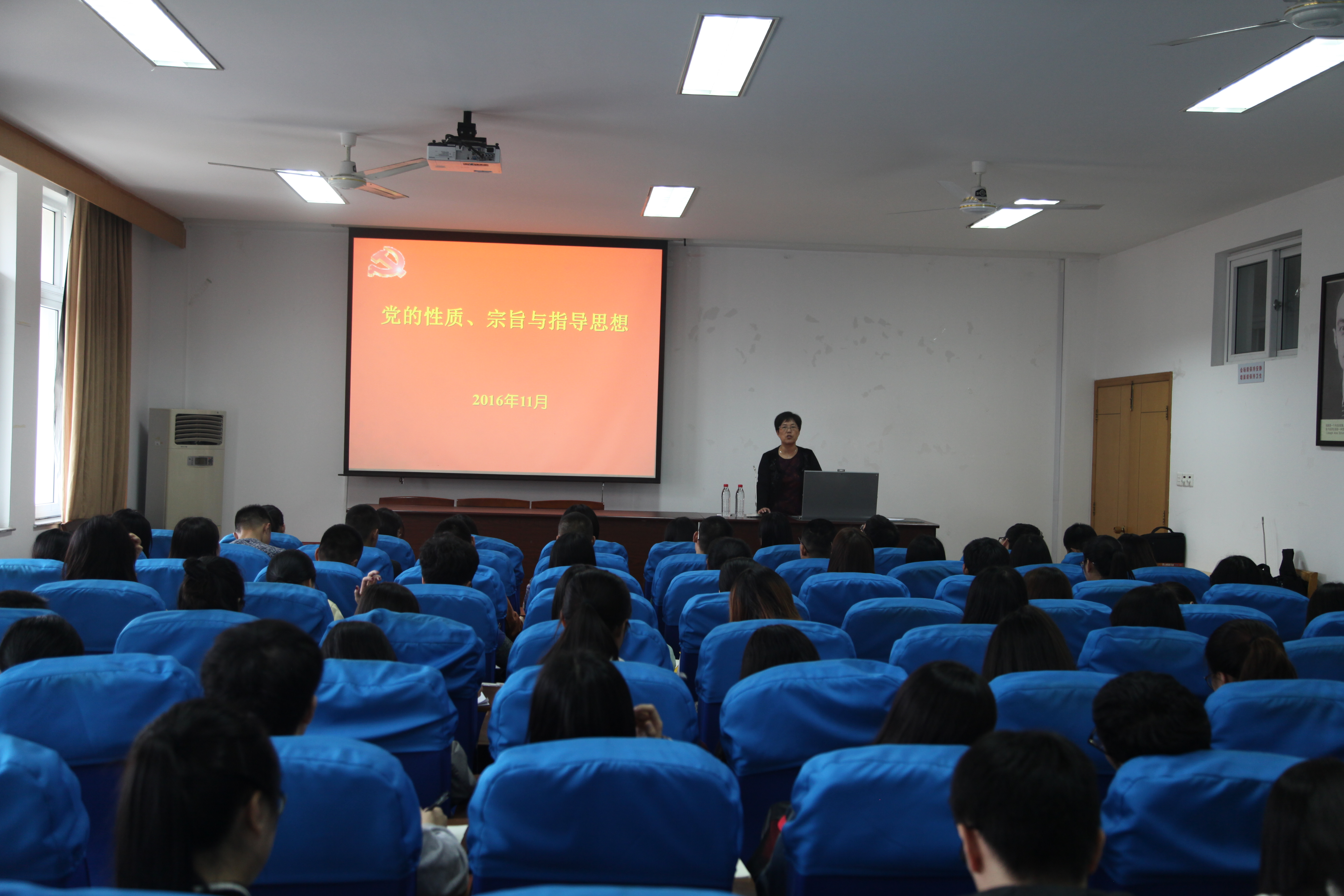 11月21日中午,糖心视频党委分党校第35期入党积极分子培训班在包玉书科学楼11#414会议室正式开班。近100名积极分子参加了这次的动员报告。糖心视频 党委书胡亚娥作了开班动员,并为全体入党积极分子上了题为《中国共产党的性质与指导思想》的党课。