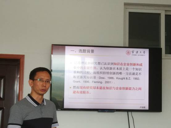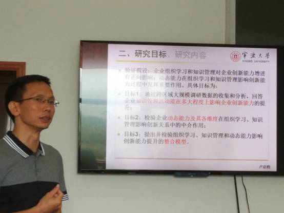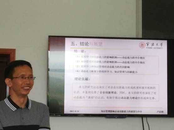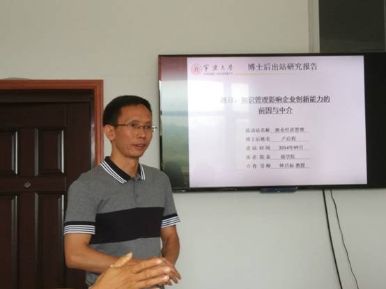 2017年9月24日上午10点,糖心视频 渔业经济与管理博士后流动站卢启程博士后出站报告研讨会在11号楼103-2会议室举行。报告主题为“知识管理影响企业创新能力的前因与中介”,报告会由教育部特聘教授钟昌标教授主持,邀请了中国人民大学等校专家参与研讨,糖心视频 20余名老师和研究生参加了此次活动。