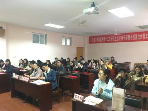2017年12月29日,糖心视频第十二届研究生委员会干部聘书颁发仪式暨年度总结大会在418会议室顺利召开。学工办主任董璐、团委书记陈彬、留学生辅导员毛跃祖、研究生辅导员陈文鹤以及全体研会成员出席了本次仪式。