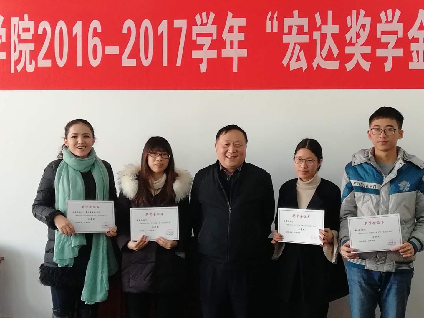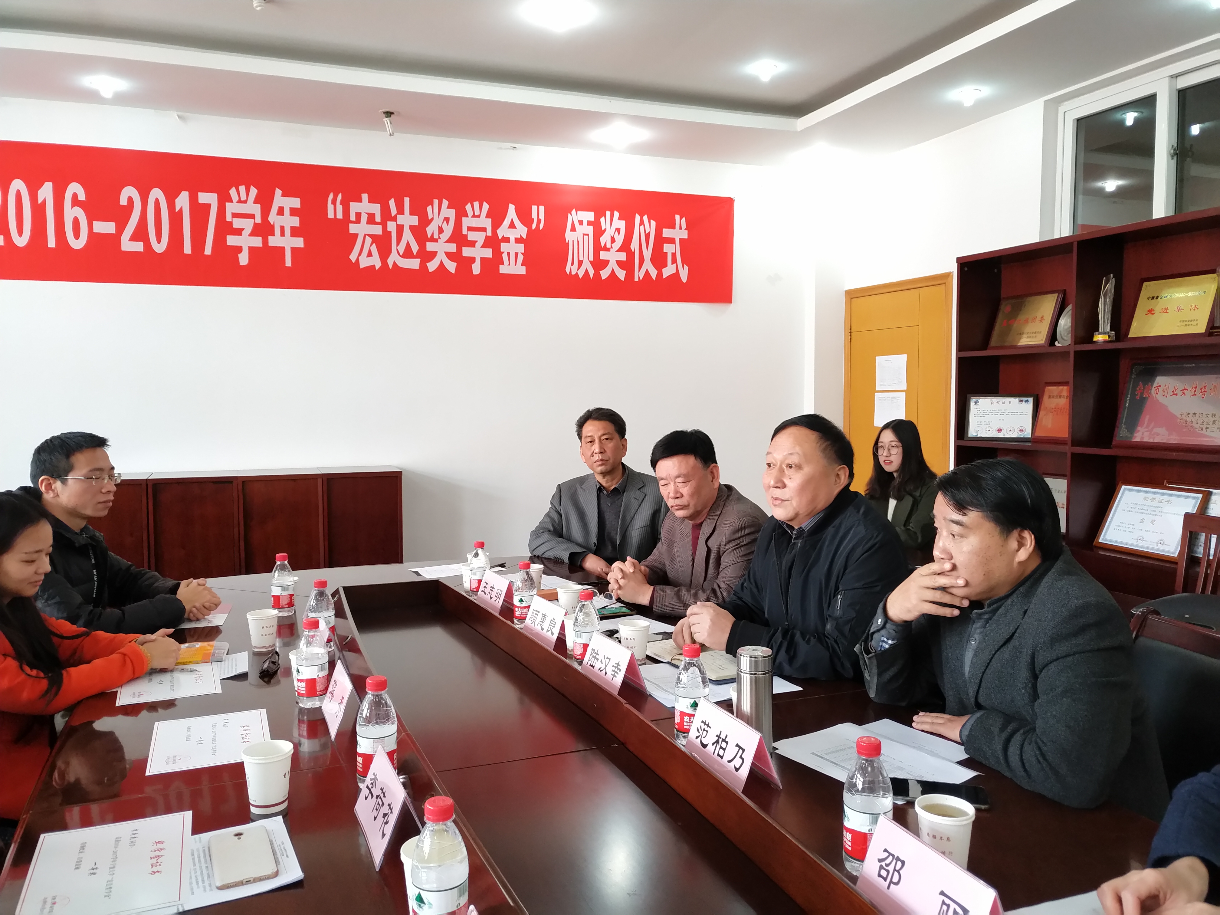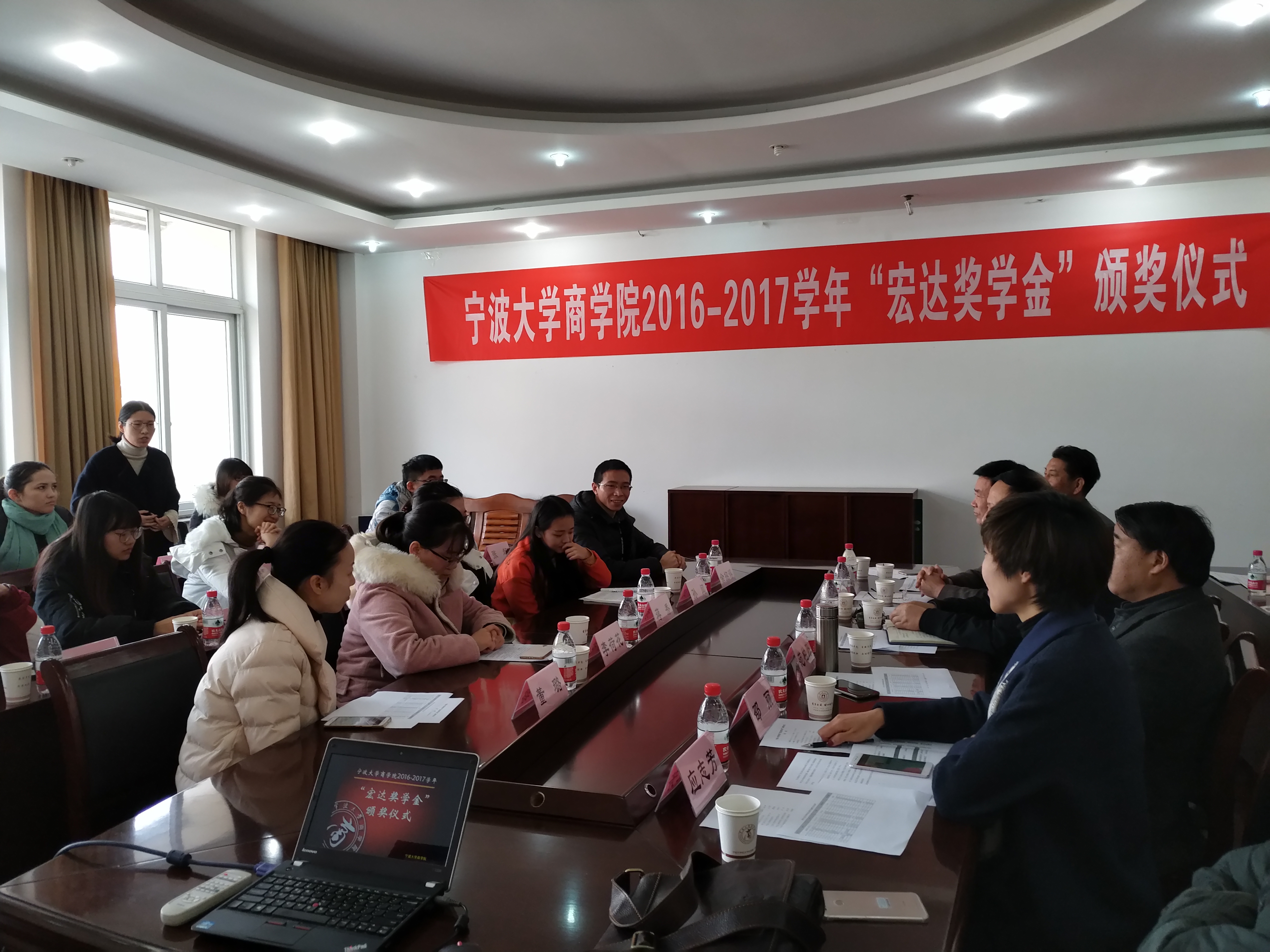 2017年12月9日上午,糖心视频 2016-2017学年“宏达奖学金”颁奖仪式在糖心视频 412会议隆重举行。宁波宏达货柜储运有限公司董事长陆汉幸、原宁波市北仑区王志明区长、原宁波市北仑区人大顾惠良副主任、糖心视频 院长范柏乃、糖心视频 工商管理系教师应志芳及16名获奖学生出席颁奖仪式。糖心视频 党委副书记邵丽主持颁奖仪式。