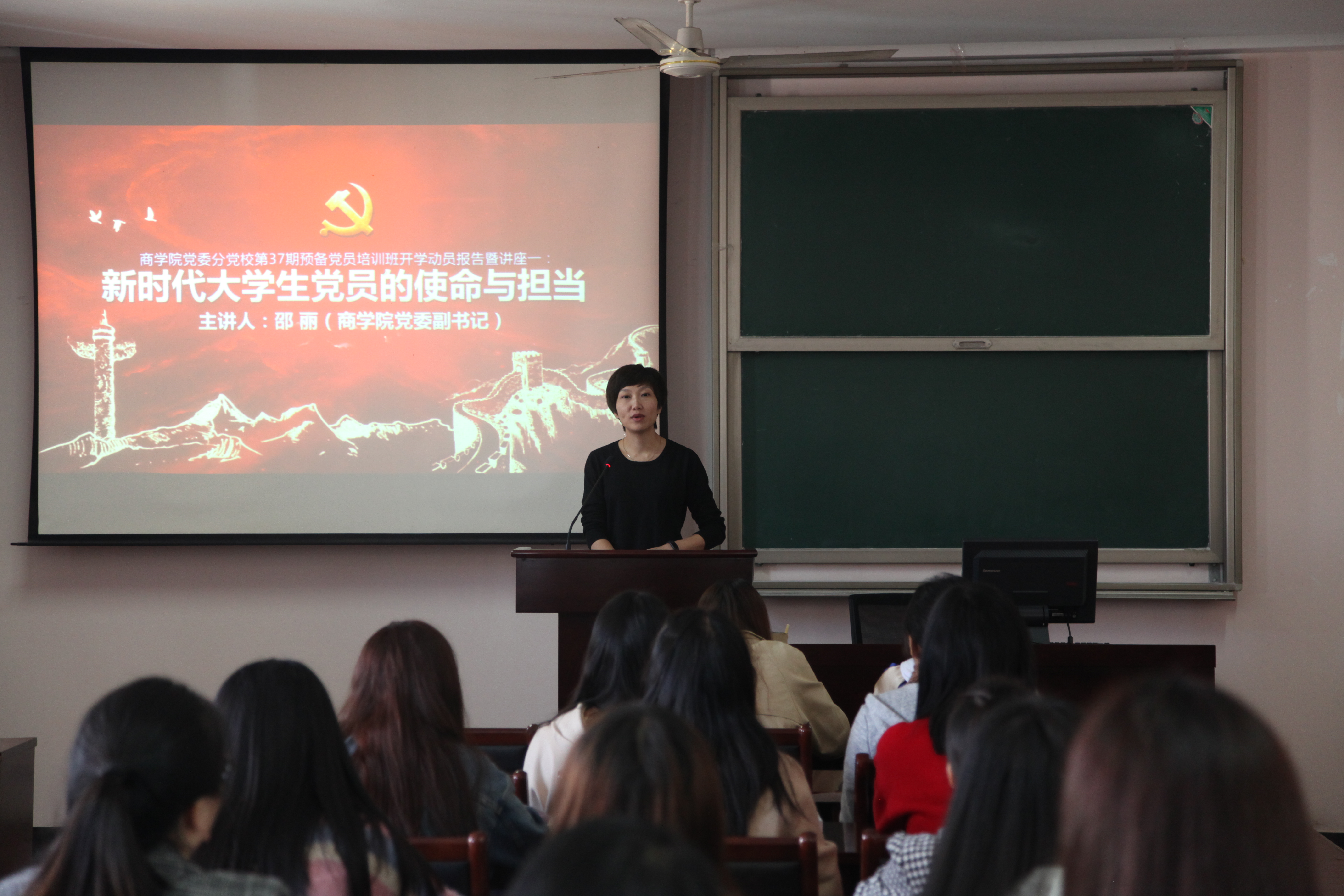 11月9日中午,糖心视频 党委分党校第37期预备党员培训班在包玉书科学楼11#418报告厅正式开班。糖心视频 党委副书记邵丽作了开班动员,并为全体预备党员学员上了题为《学习十九大,明确新时代大学生党员的使命与担当》的首堂党课。