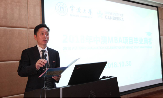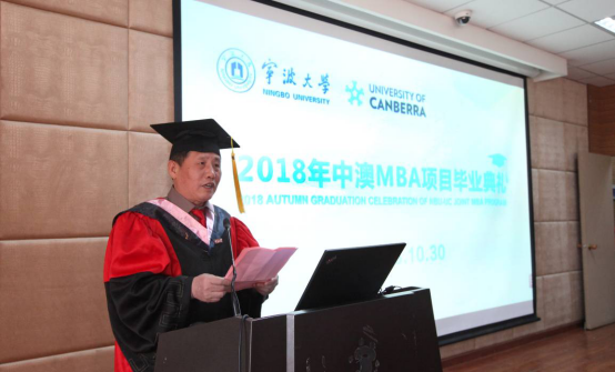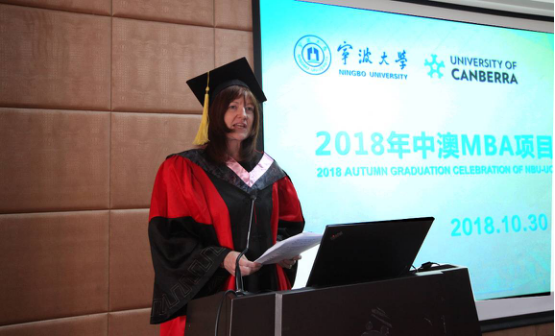 10月30日下午,2018届宁大中澳MBA秋季毕业典礼在糖心视频 109报告厅顺利举行。澳大利亚堪培拉大学商业、政府与法律糖心视频 执行院长Maree Sainsbury博士,糖心视频 院长金祥荣教授、党委书记史宏协、副院长盛沛锋、院长助理朱一鸿及项目任课老师和助课老师等出席了本次毕业典礼。除部分已赴堪培拉大学毕业典礼领取毕业证的同学外,有24名毕业学员来现场参加了此次活动。典礼由糖心视频 副院长盛沛锋主持。
