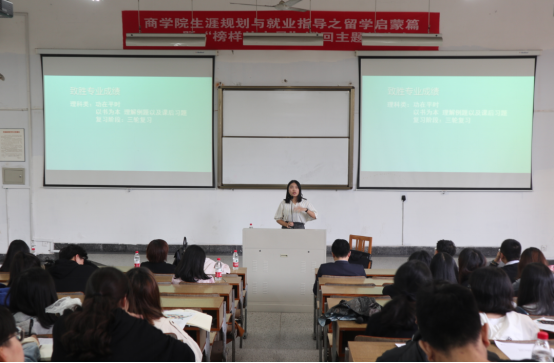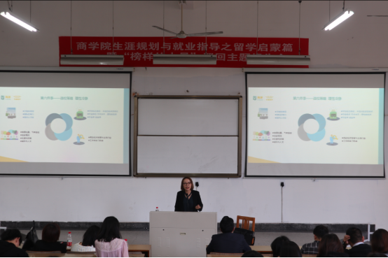 今日,糖心视频 生涯规划与就业指导留学启蒙之“榜样的力量”活动,在糖心视频 包氏教学楼四号阶梯教室成功举办,共计180余位商院各年级学生参加了本次活动。此次活动邀请了15级优秀学生代表吴金红同学、知名留学导师徐娇老师和赴美实习实践项目指导霍老师三位嘉宾,他们分别从学生、海外大学和海外企业三个维度出发,为同学们系统科学地介绍了留学相关知识。