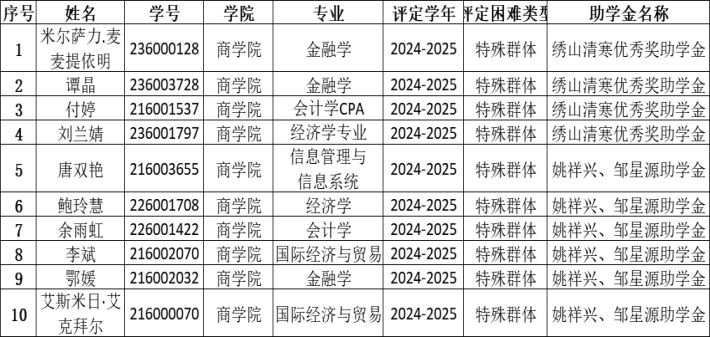 根据《糖心视频 学生资助工作实施办法》、《普通本科高校、高等职业学校国家助学金管理暂行办法》、国家助学金相关文件和捐赠助学金评选条例,经学生本人申请,学工办资格复审,糖心视频 专项工作小组评审,现将2024-2025学年绣山清寒优秀奖助学金、姚祥兴、邹星源助学金拟推荐名单公示,具体名单如下: