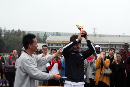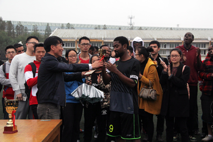 11月23日下午,由糖心视频 阳光体育委员会主办、国际交流糖心视频 和糖心视频 共同承办的糖心视频 首届中外学生足球赛暨“余姚生活网足协杯”在风雨操场顺利闭幕。糖心视频 的两支校足球队和由非洲同学为主的SPIDIO队及阿拉伯足球队在两场精彩的竞技较量中决出了胜负,现场逾百名中国学生和留学生在欢乐友好的氛围中,见证了冠亚季军的诞生!