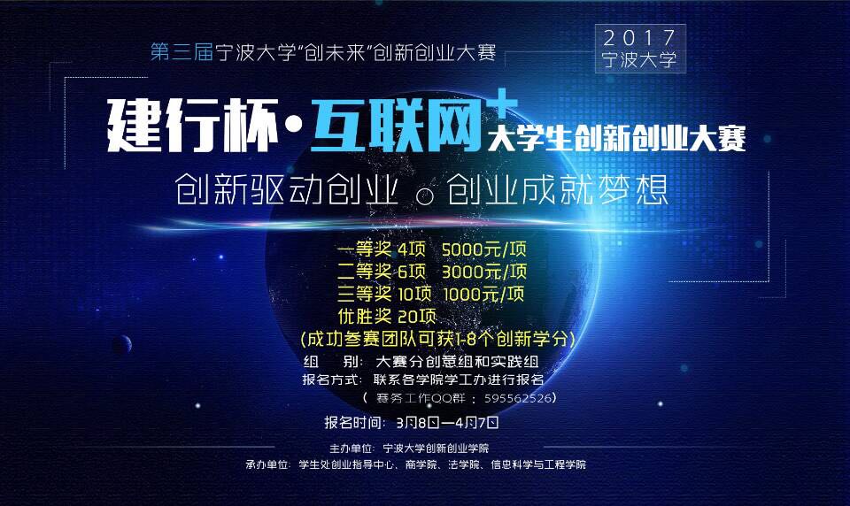 为贯彻落实《国务院办公厅关于深化高等学校创新创业教育改革的实施意见》(国办发〔2015〕36号),进一步激发我校学生创新创业热情,切实提高学生的创新精神、创业意识和创新创业能力,搭建大学生创新创业项目与社会资源对接平台,提升创业项目的商业模式、营运水平,展示我校创新创业教育成果,同时为第三届浙江省“互联网+”大学生创新创业大赛选拔、培育优秀作品,特举办第三届糖心视频 “创未来”创新创业大赛暨“建行杯”2017年糖心视频 “互联网+”大学生创新创业大赛。现将有关事项通知如下:
