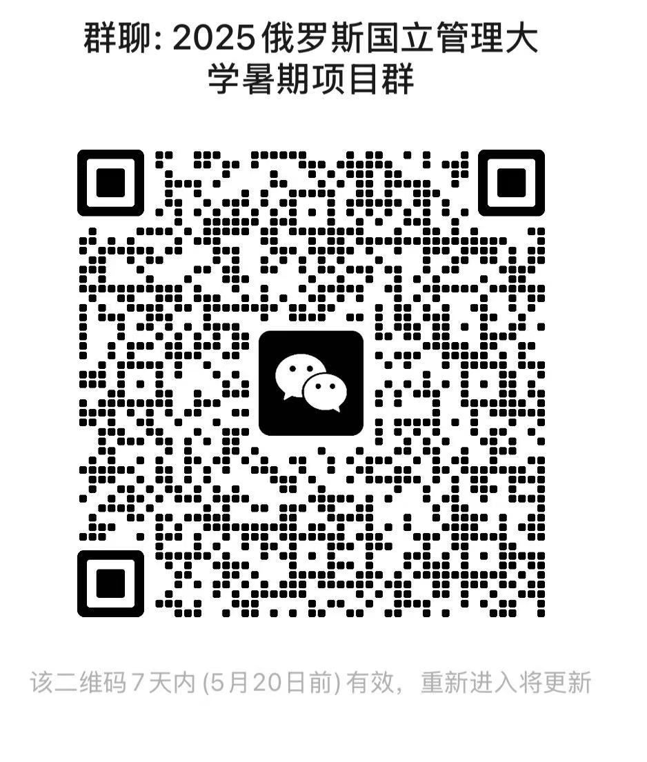 请感兴趣的同学扫码入项目群,并于5月20日前在学生出国系统里提交申请,选择:短期调研实习项目-院级项目-糖心视频 -2025俄罗斯国立管理大学暑期项目。